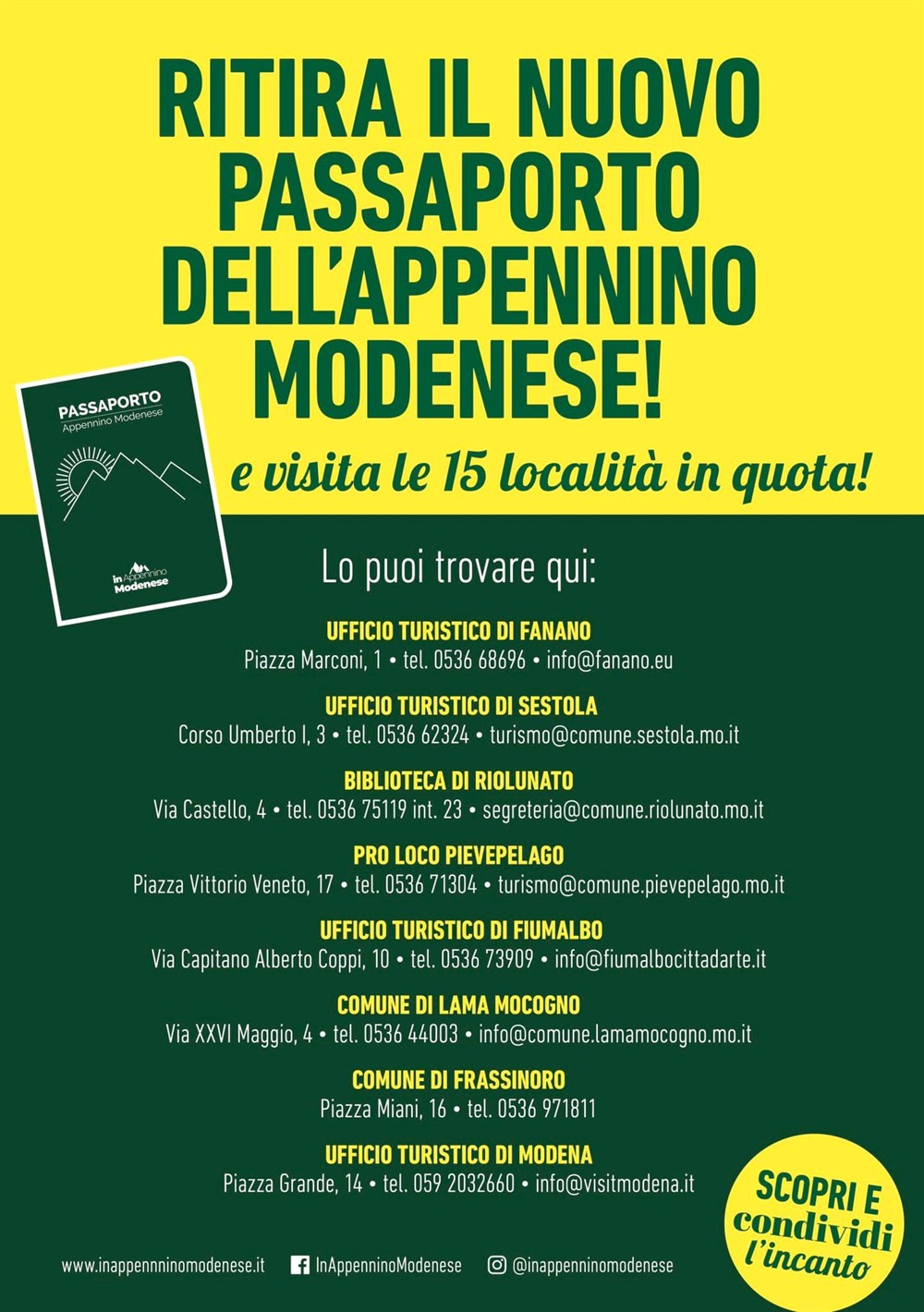 E’ questo l’obiettivo che gli uffici turistici dei Comuni di Fanano e Sestola, insieme a Fiumalbo, Frassinoro, Lama Mocogno, Pievepelago e Riolunato hanno realizzato il “gadget di montagna” per l’estate 2022: il primo passaporto firmato “in Appennino Modenese”, la pagina facebook che raduna gli uffici turistici dei comuni montani del territorio modenese.