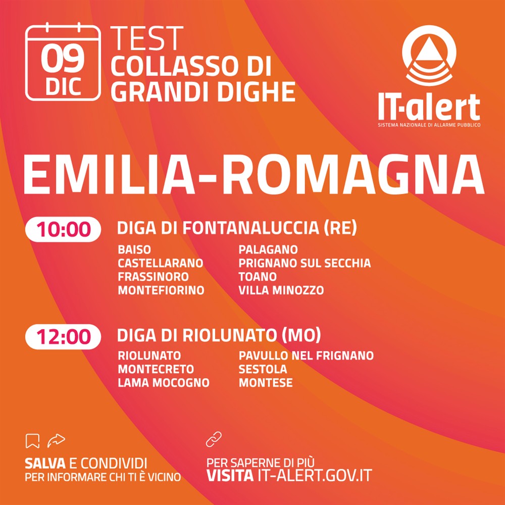 ü Il giorno 09 dicembre 2024, indicativamente intorno alle ore 12:00, simulando il collasso della Diga di Riolunato, tutti i telefoni cellulari smartphone collegati a celle di telefonia mobile nei Comuni a valle della Diga di Riolunato, riceveranno un messaggio di allarme con un suono diverso dalle normali notifiche. Si tratta di un TEST, quindi chi riceve il messaggio non ha nulla da temere, e non dovrà fare nulla tranne leggere il messaggio stesso. L’invito per tutti, che abbiano ricevuto correttamente il messaggio o meno, è ad andare sul sito it-alert.it e rispondere al questionario: le risposte fornite permetteranno di migliorare il sistema.