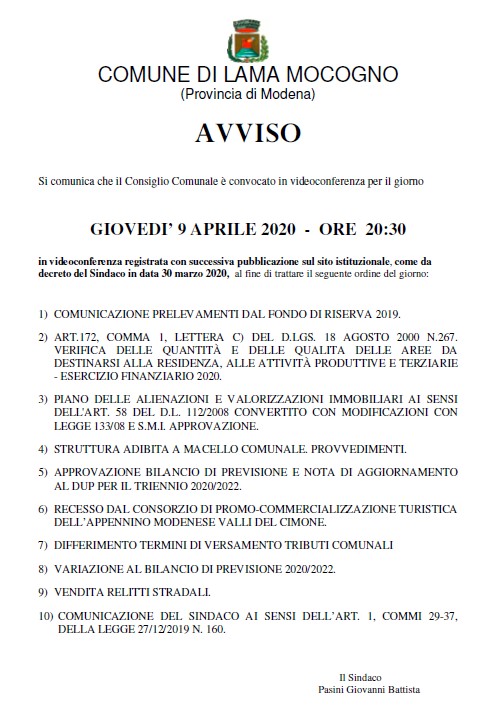 Avviso di Convocazione del Consiglio comunale il 9 aprile 2020 in videoconferenza registrata con successiva pubblicazione sul sito istituzionale