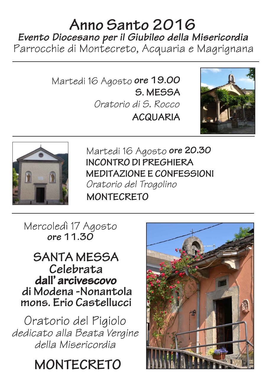 17 Agosto ore 11:30 a Montecreto Santa Messa presieduta dall'Arcivescovo di Modena-Nonantola Mons. Erio Castellucci, presso l'Oratorio dedicato alla Madonna della Misericordia in via Vaccari, Contrada Piggiolo