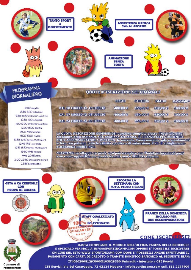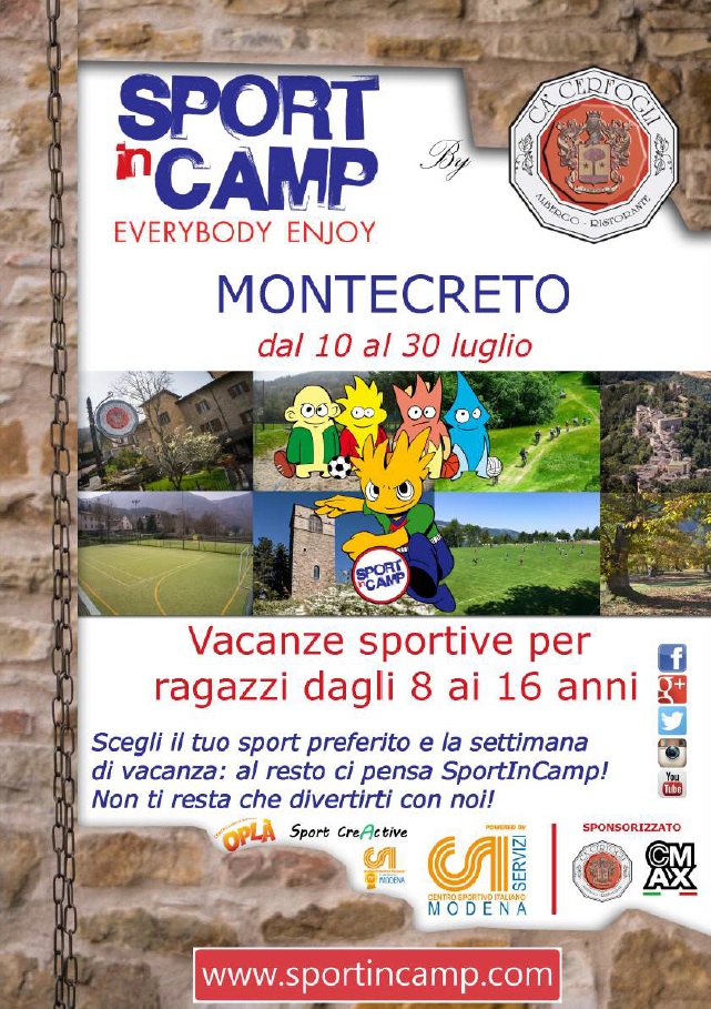 Sport CreActive in collaborazione con il C.S.I. di Modena presentano SportInCamp, vacanze sportive settimanali per bambini e ragazzi. L’idea nasce dalla volontà e dall’esperienza di giovani specialisti del settore di creare camp settimanali all’insegna dello sport e del divertimento, puntando sulla qualità degli istruttori, delle strutture e sull’aspetto educativo e valoriale che solo lo sport può trasmettere.