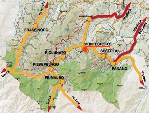 dal Nord Italia, si esce al casello Modena Sud dell'autostrada del Sole, proseguendo in direzione Vignola fino a Fanano-Sestola;