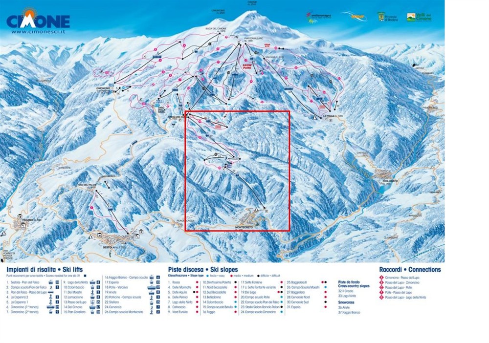 Montecreto fa parte del comprensorio sciistico del monte Cimone insieme a Fanano, Riolunato e Sestola. Il comprensorio del Cimone, offre il più grande carosello sciistico dell'Appennino tosco - emiliano, con 50 km di piste tutte collegate tra loro, accessibili con un unico skipass elettronico e servite da impianti moderni e veloci.