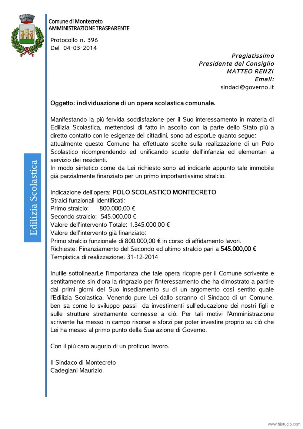 Inutile sottolinearLe l'importanza che tale opera ricopre per il Comune scrivente e sentitamente sin d'ora la ringrazio per l'interessamento che ha dimostrato a partire dai primi giorni del Suo insediamento su di un argomento così sentito quale l'Edilizia Scolastica. Venendo pure Lei dallo scranno di Sindaco di un Comune, ben sa come lo sviluppo passi da investimenti sull'educazione dei nostri figli e sulle strutture strettamente connesse a ciò. Per tali motivi l'Amministrazione scrivente ha messo in campo risorse e sforzi per poter investire proprio su ciò che Lei ha messo al primo punto della Sua azione di Governo.
