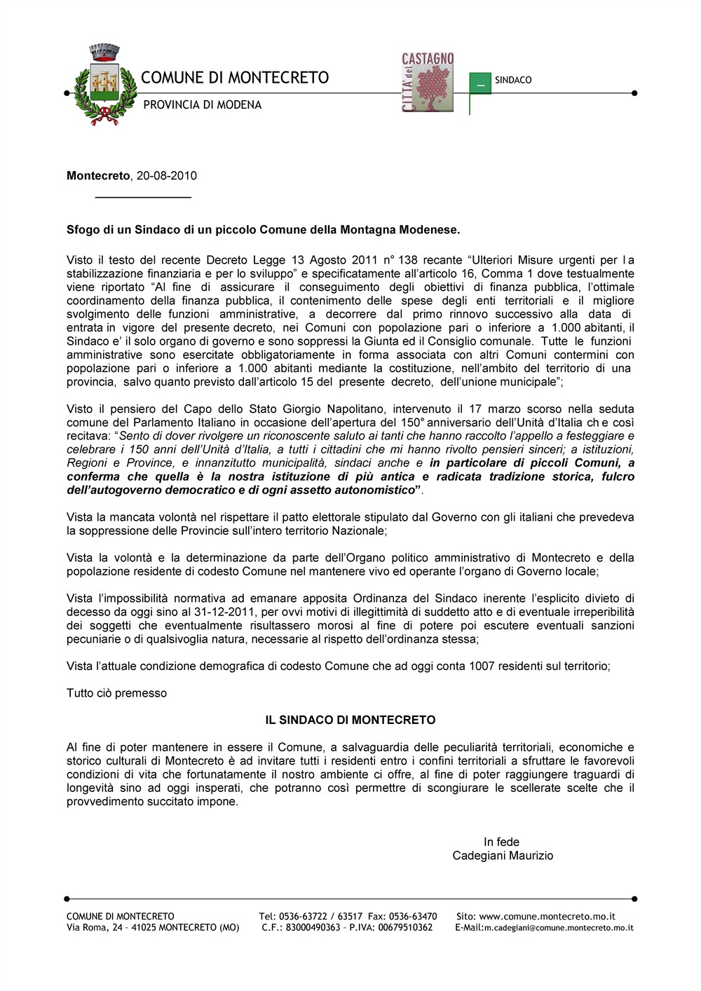 Ennesima provocazione del sindaco di Montecreto che spedisce agli organi di informazione una lettera aperta indirizzata a tutti i suoi concittadini con l'esplicito fine di poter mantenere una buona salute nei prossimi mesi così da mantenere i residenti sopra la fatidica quota 1000.