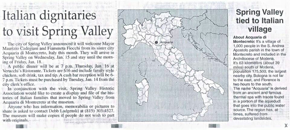 La cittadina Americana, fondata nel 1884 fu meta alla fine del 1800 di numerosi migranti provenienti da tutto il Frignano in cerca di lavoro dislocato nelle miniere di carbone del Northern Illinois. Famosa purtroppo fu la tragedia mineraria di Cherry, località dell'Illinois centro-settentrionale, che ebbe luogo il 13 novembre del 1909. Nel disastro perirono 259 lavoratori, tra cui 73 italiani (44 dei quali provenienti dall'Emilia Romagna). Per dimensioni della tragedia, quella di Cherry è per l'Italia inferiore solo ai drammi di Monongah (West Virginia) del 1907, di Dawson (New Mexico) del 1913 e di Marcinelle (Be) del 1956. Molti di questi erano migrati proprio dai territori dell'alto Appennino Modenese, e grazie ad uno studio meticoloso e particolarmente approfondito da parte della Sig.ra Giliola Burgoni, sono emerse innumerevoli ed appassionanti storie di persone provenienti da Montecreto e dai comuni limitrofi. Lo sfondo è dunque la tragedia delle miniere di Cherry, ma in realtà le ricerche hanno portato alla luce come parte della comunità di Spring Valley abbia radici nei nostri luoghi, sull'appennino Modenese e Bolognese. Da qui i primi contatti con il Sindaco Walt Marini, ed il viaggio del Sindaco Cadegiani concordato proprio con il Mayor di Spring Valley. Il viaggio in Illinois del Sindaco di Montecreto avrà proprio lo scopo di reinsaldare i rapporti tra le due comunità così distanti eograficamente, ma vicine per le innumerevoli storie dei migranti che partirono proprio dalle nostre zone stabilendosi nella cittadina che oggi conta circa 3500 abitanti. Incontri con Istituzioni locali e scuole del posto contribuiranno proprio a rinsaldare questi rapporti tra le due comunità. L'obbiettivo non sarà solo quello del canonico gemellaggio tra due luoghi tra loro affini, ma anche lo scambio culturale ed economico. Sei giorni tra viaggio e visite di una delegazione Comunale in visita nelle terre che ospitarono nostri concittadini a cavallo dei primi anni del '900. Il viaggio, a spese dei partecipanti e a costo zero per le casse Comunali, si terrà dal 15 al 21 gennaio prossimi.