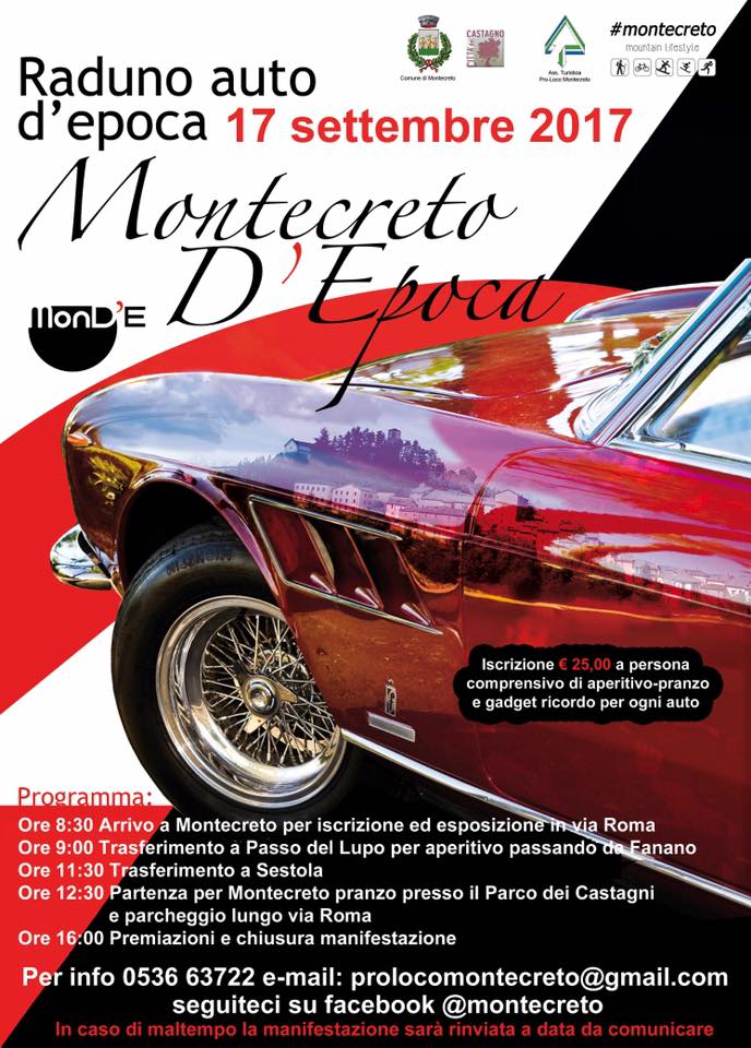 Il raduno inizierà alle ore 8 di domenica 17 settembre con la mostra delle autovetture partecipanti, che verranno posteggiate lungo via Roma; alle 9 partirà il giro panoramico, che terminerà all’ora di pranzo con un momento conviviale per tutti i partecipanti, che gioiranno delle prelibatezze gastronomiche preparate dalla Pro Loco di Montecreto. Gli scorsi anni hanno preso parte alla manifestazione auto storiche datate dagli anni ’30, con la sfilata di Bugatti, Ferrari, Maserati, Fiat e tante altre casate nazionali e internazionali.